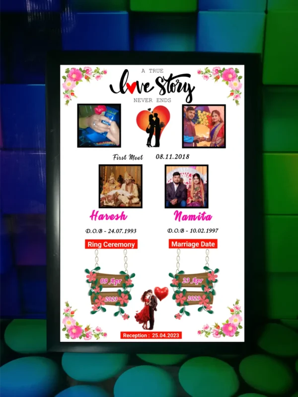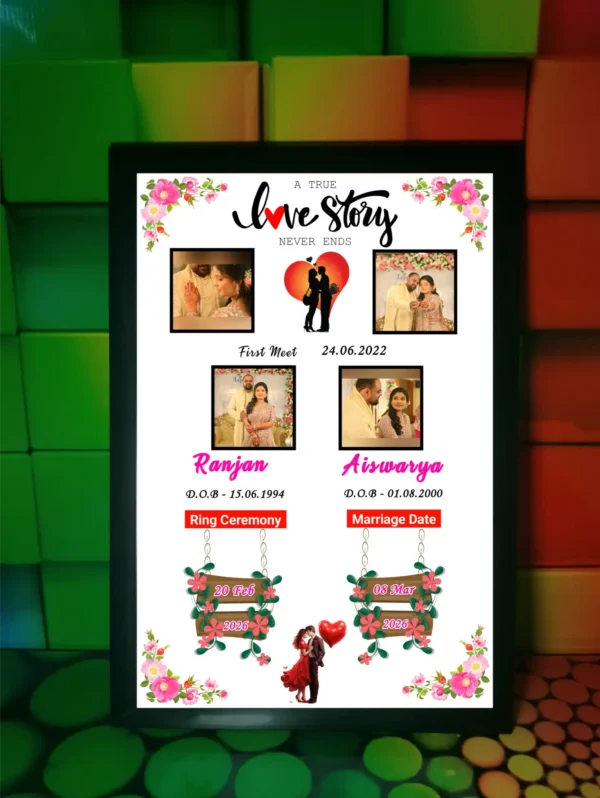 Celebrate your journey together with a beautiful love story photo frame, designed to showcase your special moments from beginning to forever. Personalized with photos, name, and date, it’s a perfect gift for anniversaries, birthdays, and romantic occasions.
